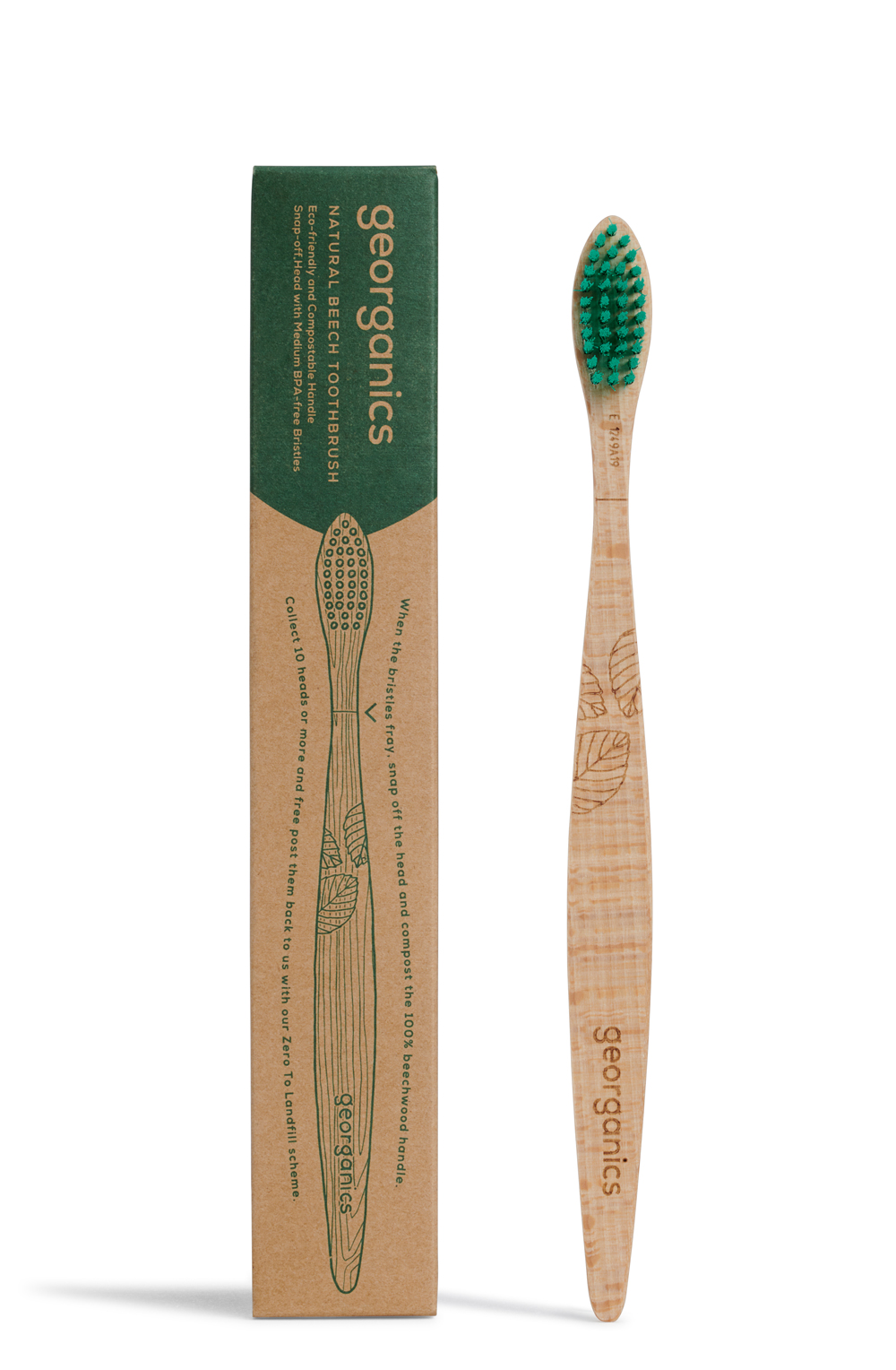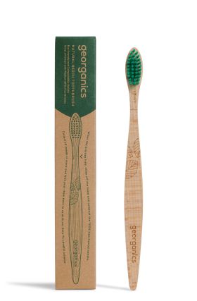 Periuțele de dinți Georganics – zero plastic, în schimb, un mâner biodegradabil realizat din lemn de fag din Elveția, certificat FSC. Perii nu conțin BPA. Ca orice periuță de dinți utilizată corect, aceasta trebuie înlocuită la aproximativ fiecare 3 luni și, după folosire, așeazată în pahar astfel încât perii să se poată usca în intervalul dintre folosiri.