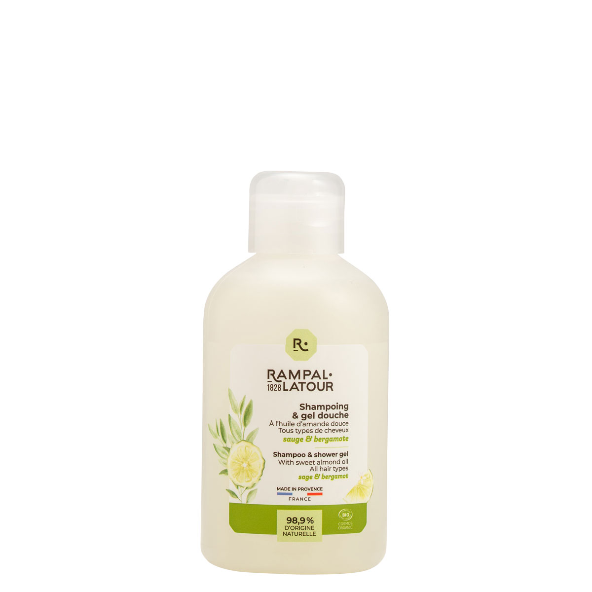 Gel de duş & şampon certificat bio, hidratant şi relaxant, cu salvie şi bergamotă.