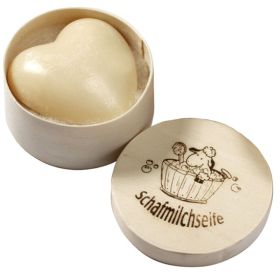 Săpunul cremos sub formă de inimioară albă este ambalat într-o cutie cadou din lemn și serigrafiată cu un desen adorabil.