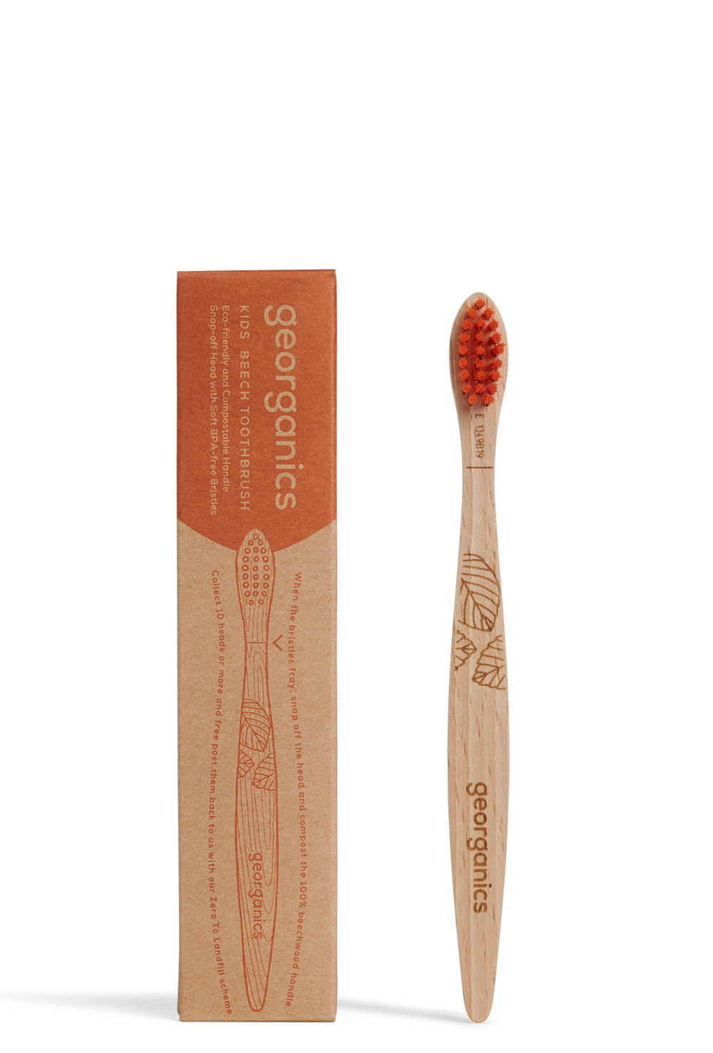Periuțele de dinți Georganics – zero plastic, în schimb, un mâner biodegradabil realizat din lemn de fag din Elveția, certificat FSC. Perii nu conțin BPA. Ca orice periuță de dinți utilizată corect, aceasta trebuie înlocuită la aproximativ fiecare 3 luni și, după folosire, așeazată în pahar astfel încât perii să se poată usca în intervalul dintre folosiri.