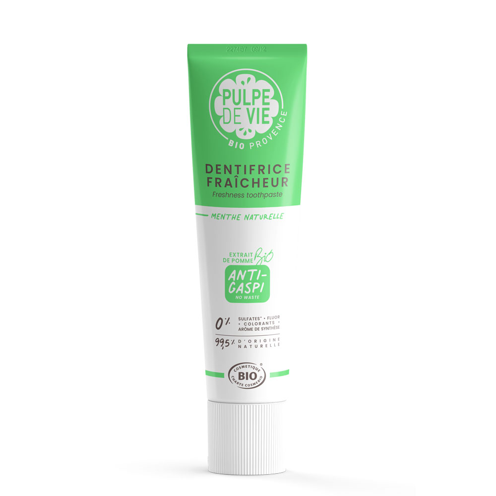 Pasta de dinți organică și naturală de la Pulpe de Vie este fără fluor, fără sulfat, fără dioxid de titan, fără triclosan, fără aluminiu, fără PEG, fără parabeni, fără propilenglicol.