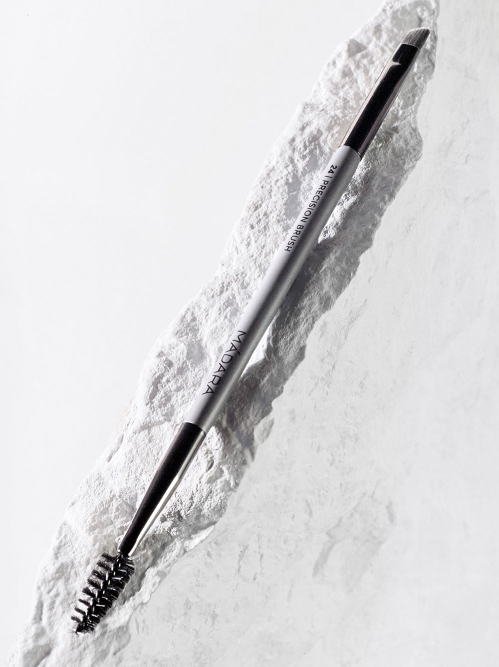Cele două capete ale periei și modalitățile complementare de aplicare a pomadei pe care acestea le permit încurajează styling-ul versatil al sprâncenelor.
