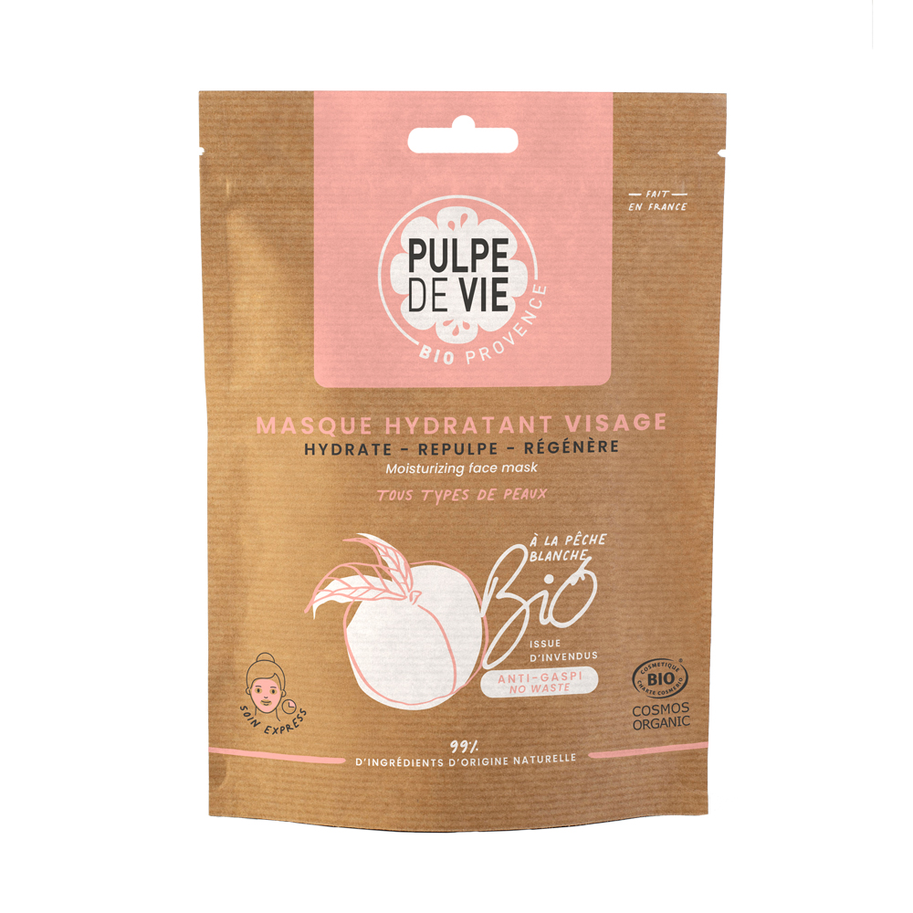 O mască facială hidratantă pe bază de extracte din piersică bio, impregnată pe o țesătură finădin bumbac organic (și biodegradabil).