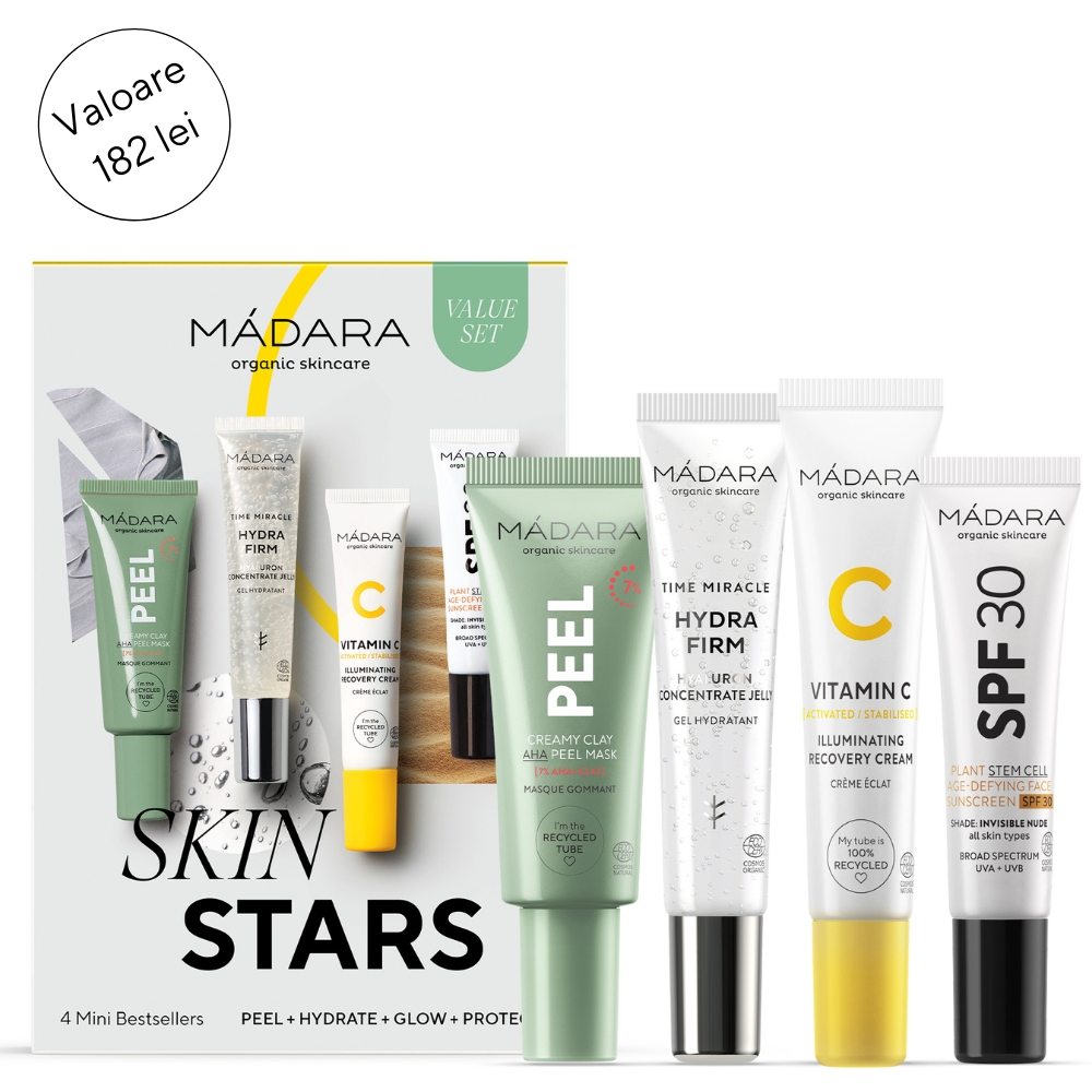 Setul MÁDARA oferă o selecție de patru produse organice pentru menținerea unui ten frumos, curat, hidratat și protejat. Bestsellers perfecte de oferit în dar, de testat pentru cine dorește să facă primii pași în universul îngrijirii organice sau pentru cine e dornic să descopere produse noi de îngrijire a tenului.
