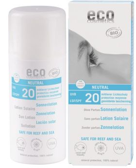Lotiune fluida de protectie solara FPS 20 cu filtre minerale, FARA PARFUM, uleiuri esentiale si alergeni, indicata pentru persoanele cu piele foarte sensibila si pentru copii. Uleiurile organice de masline si de catina din compozitie ingrijesc delicat pielea si o protejeaza de deshidratare. Nu lasa urme albe, se intinde usor si protejeaza imediat dupa aplicare. Nu contine oxid de zinc, nu blocheaza porii, Poate fi folosita atat pe fata, cat si pe corp, pentru adulti si copii – ideala pentru vacanta cu familia. Flaconul airless permite o aplicare foarte facila, nu permite contactul lotiunii cu aerul si  contaminantii, mentinand prospetimea produsului pana la terminare. Lotiunea de protectie solara Eco Cosmetics nu contine ingrediente periculoase pentru om sau pentru organismele acvatice.