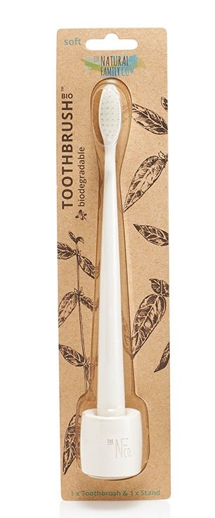 Periuta de dinti bio Nfco este complet biodegradabila, inclusiv ambalajul. Manerul este realizat din amidon de porumb nemodificat genetic, iar perii din nylon nu contin BPA.