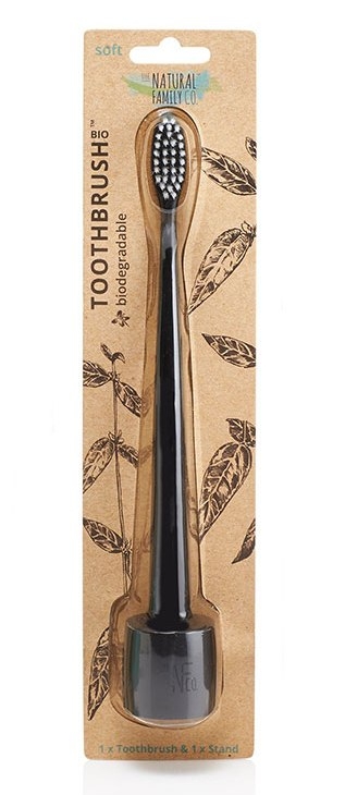 Periuta de dinti bio Nfco este complet biodegradabila, inclusiv ambalajul. Manerul este realizat din amidon de porumb nemodificat genetic, iar perii din nylon nu contin BPA.
