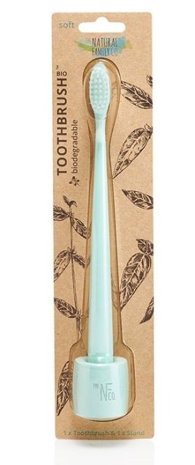 Periuta de dinti bio Nfco este complet biodegradabila, inclusiv ambalajul. Manerul este realizat din amidon de porumb nemodificat genetic, iar perii din nylon nu contin BPA.