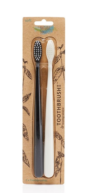 Periuta de dinti bio Nfco este complet biodegradabila, inclusiv ambalajul. Manerul este realizat din amidon de porumb nemodificat genetic, iar perii din nylon nu contin BPA.